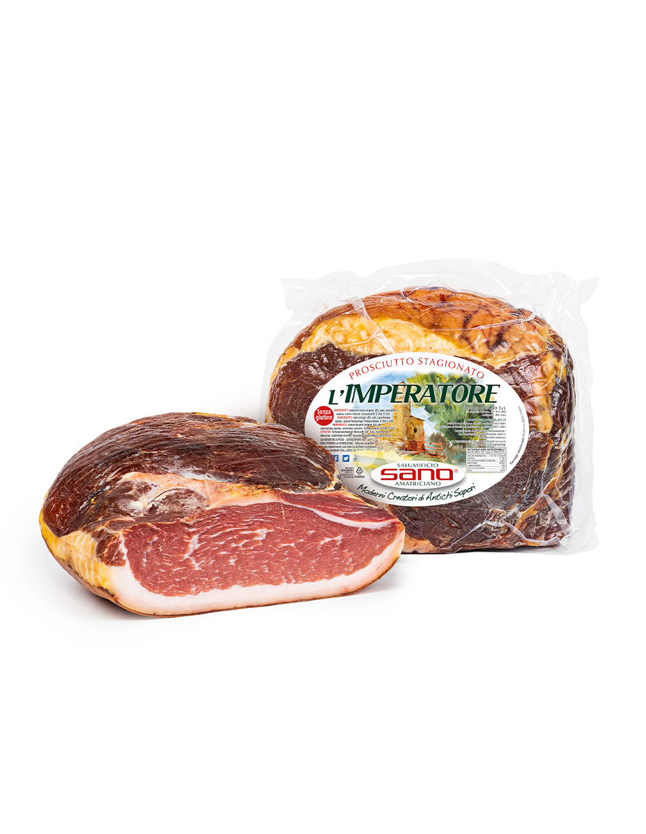 L’Imperatore, prodotto unico ed inimitabile, è un perfetto equilibrio tra dolcezza e profumo. È il risultato di una rigida ed attenta selezione della materia prima, di una lavorazione fedele alle più tradizionali pratiche artigianali e di una lenta e paziente stagionatura che si avvale dell’aria fresca e pulita del Parco dei Monti della Laga. Oltre all’unicità del gusto, è di grande interesse l’aspetto relativo alla praticità di utilizzo. Il taglio è pronto ed immediato adatto anche ai meno esperti del settore. La fetta, uniforme ed omogenea lungo tutta la lunghezza del prosciutto, si presenta imponente e con un’ottima tenuta e lo scarto è ridotto al minimo. Il colore rosso rubino viene impreziosito da bianche ed esili venature di grasso.